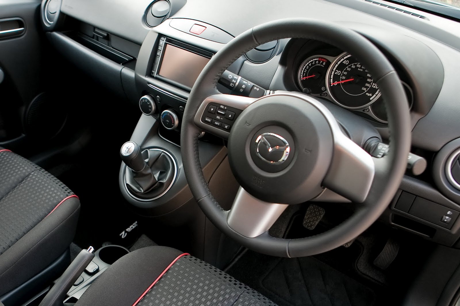 Nội thất bên trong của mazda 2 sẽ gây bất hơn với người sử dụng, với một thiết kế tinh tế, sáng tạo giúp tiết kiệm tối đa không gian cho người sử dụng. Xe có không gian rộng với nhiều khu lưu trữ, khoang hành lý lớn, tận dụng hết các cấu trúc tròn ở cửa gió, vô-lăng, bảng điều khiển trung tâm. Trang thiết bị gồm dàn CD nối với 4 loa, điều hòa chỉnh tay, kính chỉnh điện.